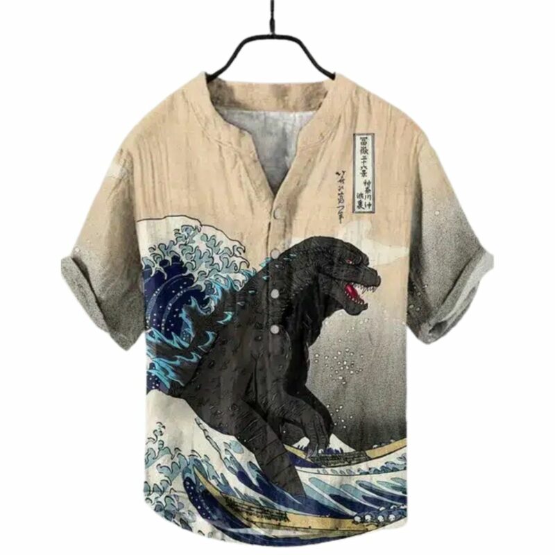 Make a splash with this unique Hawaiian shirt featuring the iconic Great Kanagawa Wave and Godzilla design. Perfect for adding a touch of fun to your wardrobe!