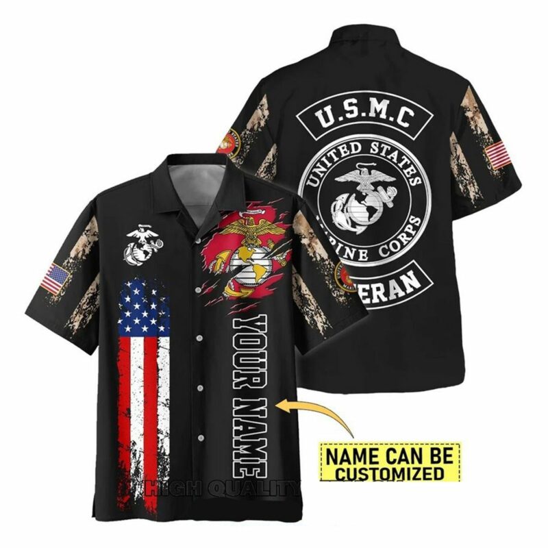 Show your pride with this personalized US Marine Corps Veterans Hawaiian shirt in red, white, and blue. Perfect for veterans and supporters alike.