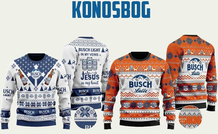 Celebrate in style with a Busch Light ugly sweater from Konosbog—shop now and bring the holiday cheer with a beer-themed twist!